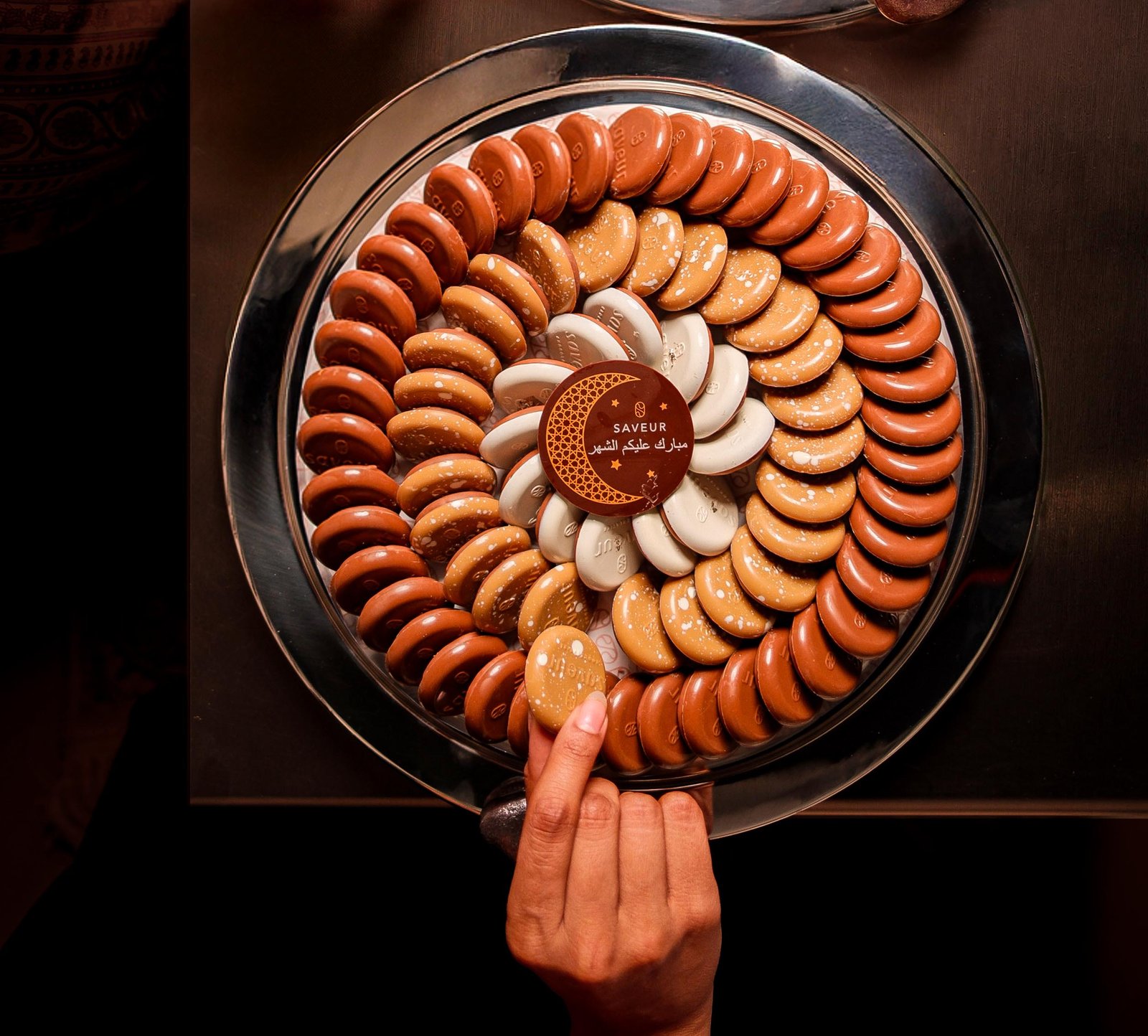 Elevate your gatherings with this luxurious silver circular tray, featuring a sleek glass lid that adds a touch of modern elegance. This centerpiece is thoughtfully designed with a stunning acrylic “Mubarak Alaykum Al Shahr” inscription, perfectly complemented by chocolates wrapped in beautiful, 55 Ramadan-themed designs.