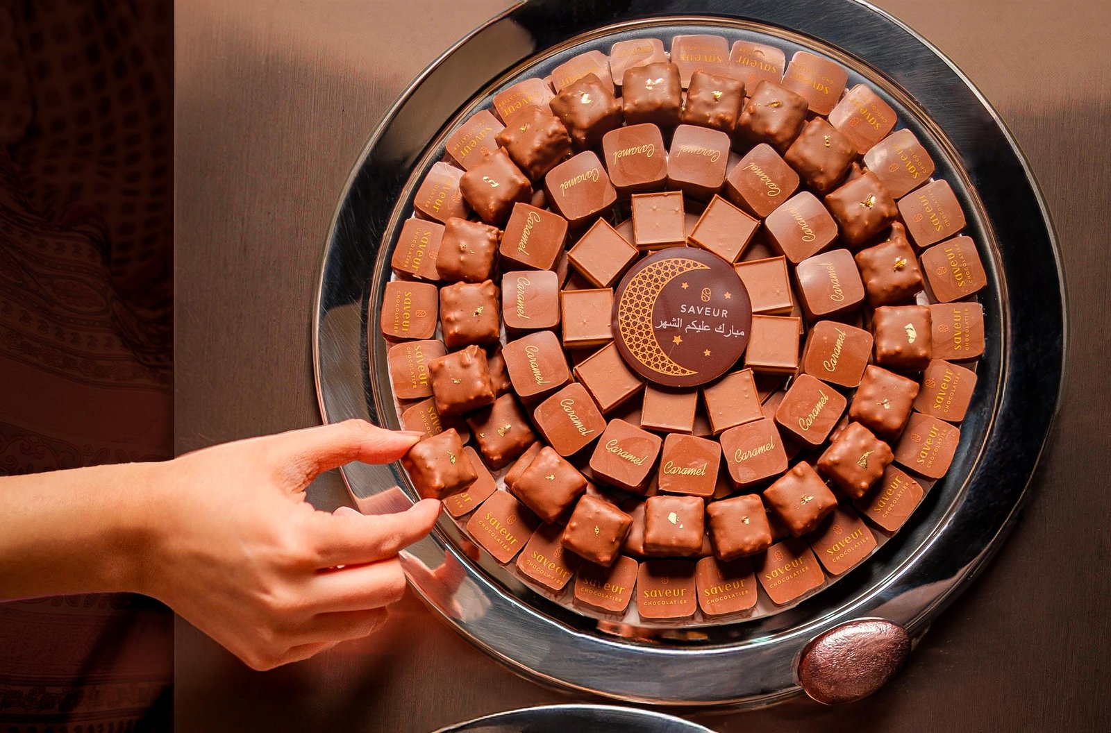 Nestled upon a Saveur Eid crystal tray, a 1 kg confectionary masterpiece presents a symphony of the best flavors in every bite.
